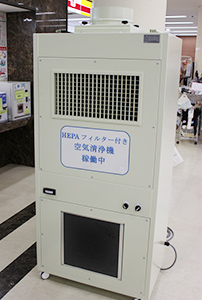 病院本館・クリニック棟の受付でアクリル板を設置しており、定期的なアルコール清拭を実施しております。また、ヘパフィルター付き空気清浄機を多数設置しており、院内は約10分で空気が入れ替わる換気能力があります。