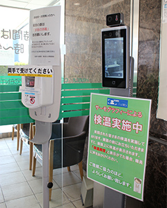 病院本館・クリニック棟内にお入りの際には、出入口に手指消毒とサーモグラフィーでの体温測定を実施しておりますのでご協力をお願いいたします。また、必ずマスクの着用をお願いいたします。