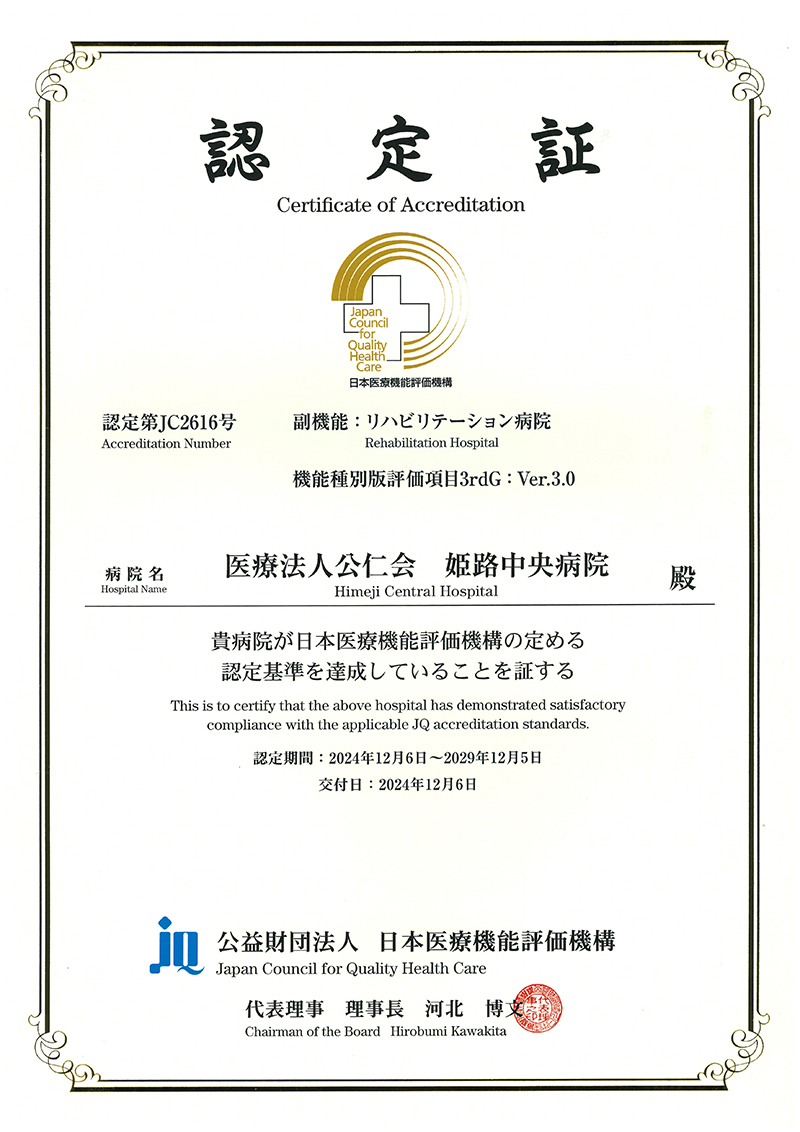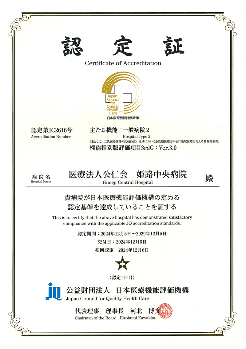 当院では公益財団法人日本医療機能評価機構が実施する病院機能評価を2024年9月5日に受審し、2024年12月6日付けで認定されました。