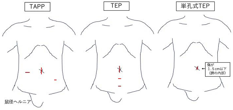 鼠径ヘルニアに対する腹腔鏡手術にはTAPP法(Trans-Abdominal Pre-Peritoneal repair)、TEP法(Totally Extra-Peritoneal repair)の二通りの方法があります。これらの手術では通常3箇所の傷で手術を行います。