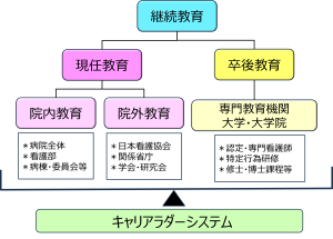 看護師の教育は、新人教育、現任教育を2本の柱とし、看護部に所属するそれぞれの職性や役割に応じた段階的教育(ラダー)システムの導入により継続教育を行う。教育の対象は看護部に所属する看護師、准看護師、介護福祉士を含めた看護補助者とし、段階的教育のほか、社会人基礎力の向上をはかることで、社会や地域から求められる人材の育成をはかる。(継続教育)社会動向・医療環境を踏まえ、果たすべき役割や専門性を深めるために外部研修、学会派遣、個々の看護職員のキャリア形成応じた研修の機会を提供する。また看護学生や研修生を受け入れ、相互で学びがあえる環境の整備および支援を行うことで、理念実現に向けた人材を育成する。
